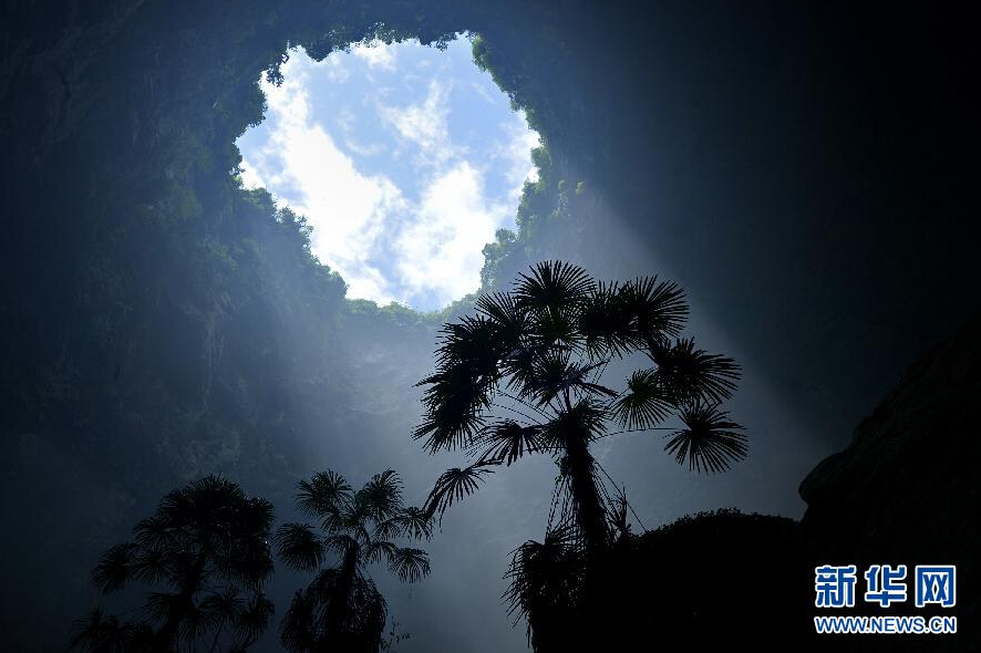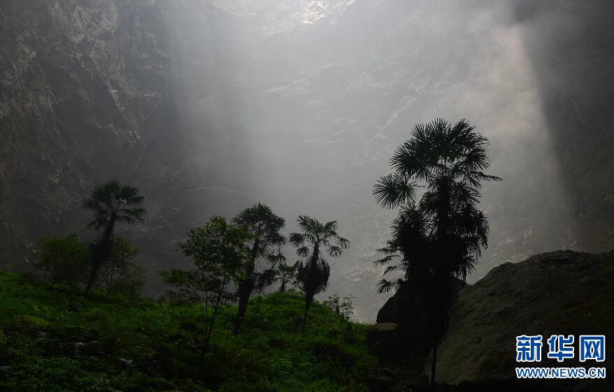 5月19日,阳光照在锣圈岩天坑里的棕树上。