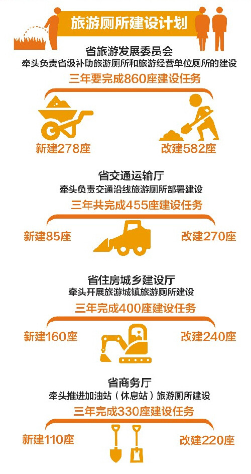 会议指出,从今年开始到2017年,将用3年时间在全省主要旅游城市和城镇游客聚集公共区域、主要乡村旅游点、旅游小镇、主要旅游景区(点)、旅游交通沿线新建、改建2045座旅游厕所(其中新建643座,改建1392座)。全省16州市、129个县区都有新建和改建任务。