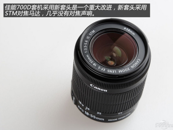 新套头成为了佳能700D套机的亮点,相比较升级不温不火的机身,新的套机镜头亮点十足,外观上看变化不算大,设计风格和前代一样,只是对焦环设计在了镜身上,而非前镜筒。紧凑感变强了。做工上的变化不大,仅仅是套头水平,亮点在于使用的是STM对焦马达,再也听不到咔咔咔咔咔的机械马达对焦声了,甚至连镜组移动的声音都听不到,这是专供视频拍摄对焦使用的,麦克风不再会录到镜头对焦的声音。对焦速度也有所提升,与老款套头有明显的性能差距。