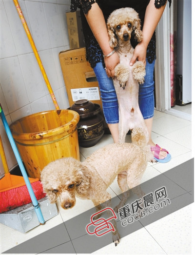 昨日,泰迪犬“仔仔”(前地面上)回到了罗女士身边。重庆晨报记者李斌摄