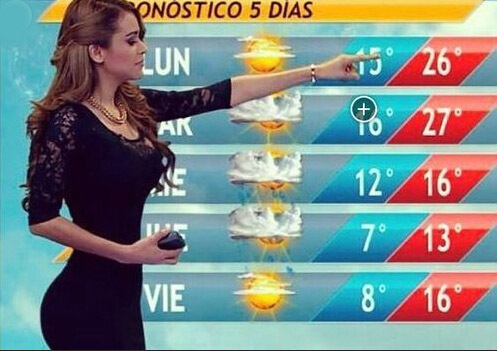 6月26日,墨西哥天气预报女主播蹿红,因为她穿得很清凉,各种短裙突显她巨乳翘臀身材,人气超级多,每次的天气预报收视率绝高的。网友纷纷表示:“内地主播什么时候跟国际接轨?”