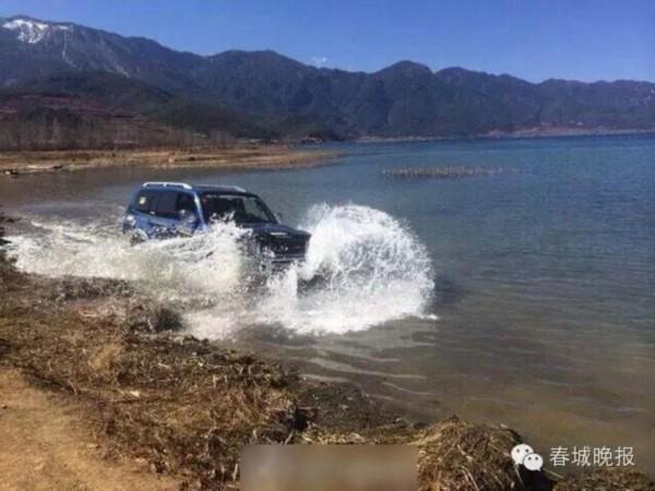 ↑图:游客开越野车泸沽湖洗车冲浪遭谴责