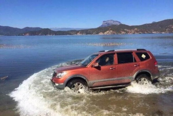 ↑图:游客开越野车在泸沽湖洗车冲浪 脑残也开始任