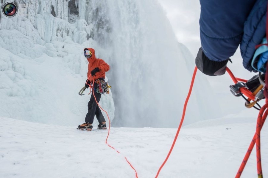 05:2015年1月27日,美国,纽约,尼亚拉加大瀑布,攀爬过程中,威尔加德正在通往冰封红牛瀑布的途中放置缆绳。