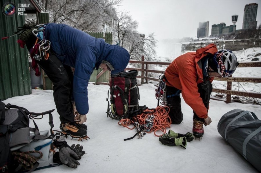 20:2015年1月26日,美国,纽约,尼亚拉加大瀑布,在攀登冰封的红牛瀑布前,威尔加德(右)和他的登山向导莎拉.休尼肯正在准备他们的攀冰装备。