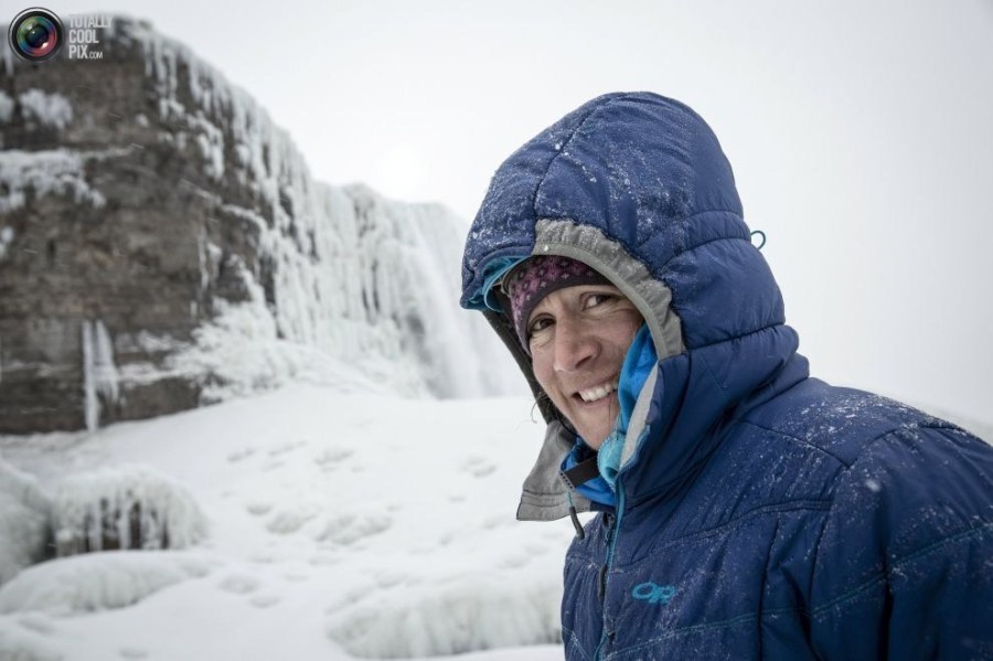 19:2015年1月26日,尼亚拉加大瀑布,这是攀登前登山向导莎拉.休尼肯(Sarah Hueniken)在攀登冰封的红牛瀑布前拍摄的肖像照。