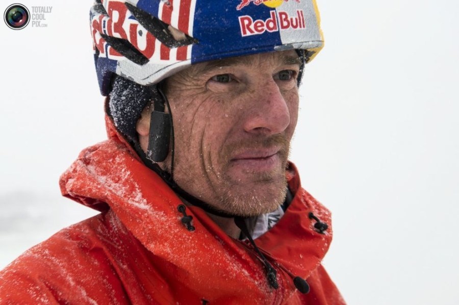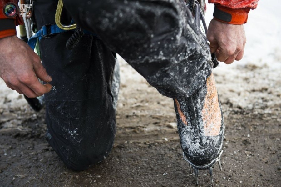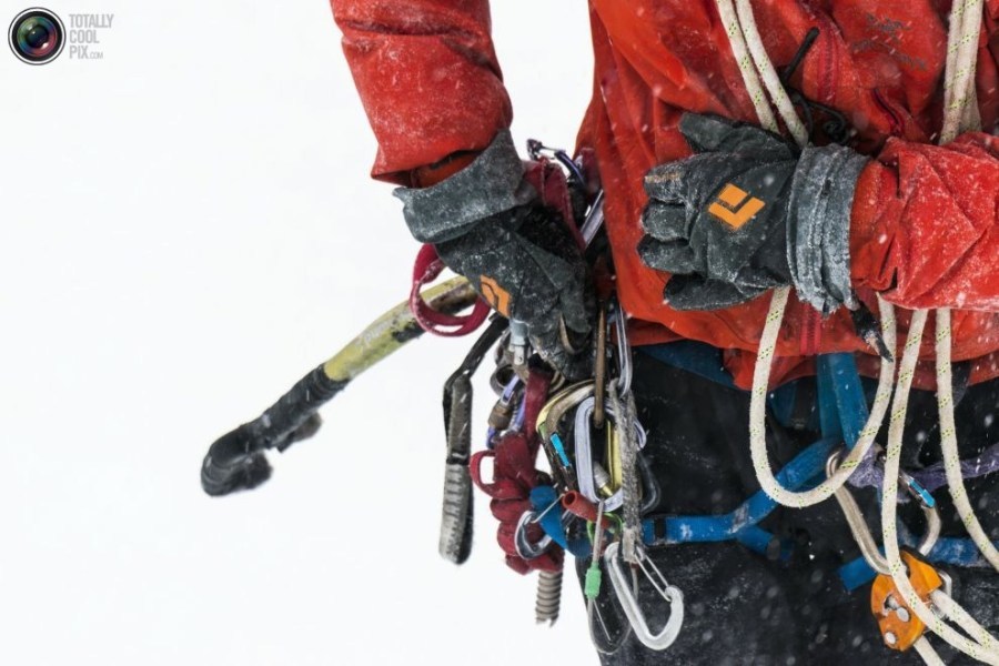 15:2015年1月27日,攀爬途中,威尔加德正在将钩冰工具固定在套具上。