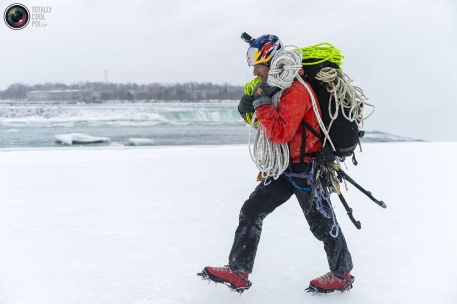14:2015年1月27日,美国,纽约,尼亚拉加大瀑布,威尔加德正负载着绳索前进,这些都是用于攀登冰封尼亚加拉大瀑布的装备。