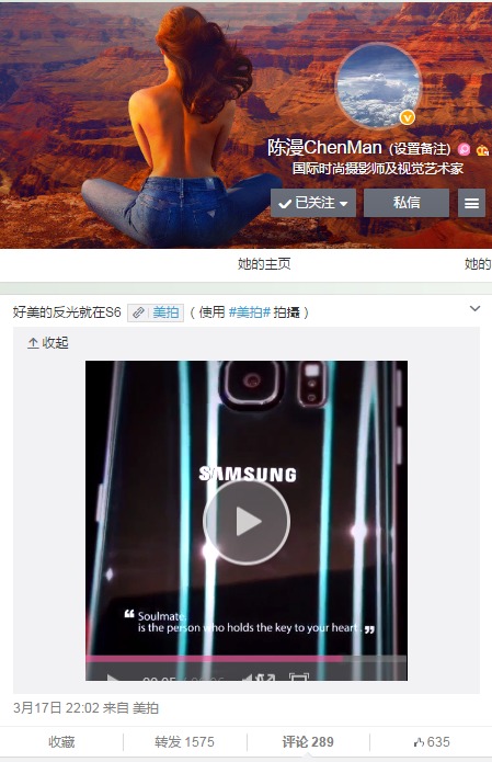 另有消息称,三星可能会和陈漫合作,共创三星GALAXY S6的视觉大片,至于其呈现形式,目前还不能确认,或许我们会在之后的三星GALAXY S6国内发布会当中见到这些大片。