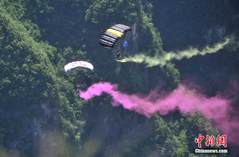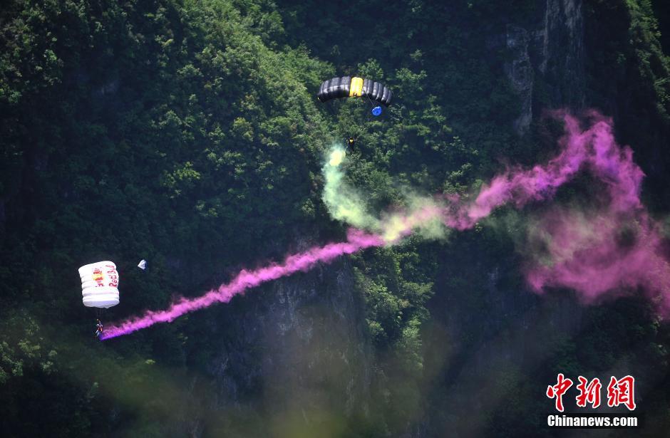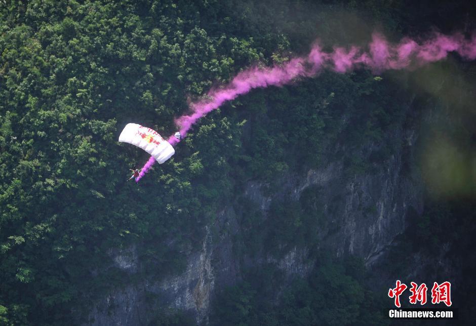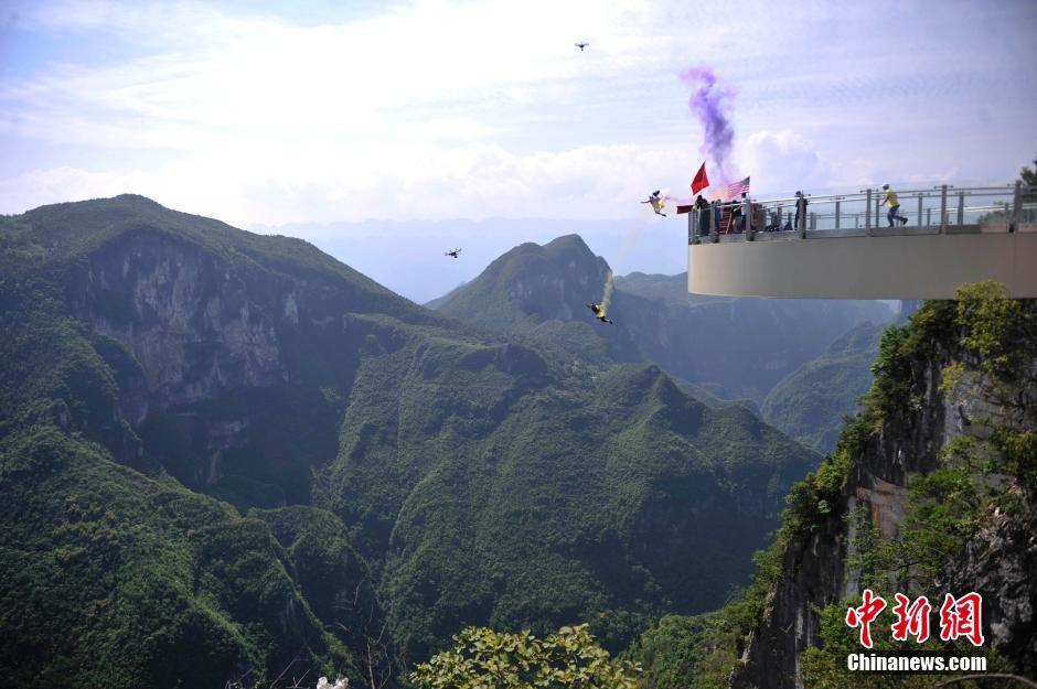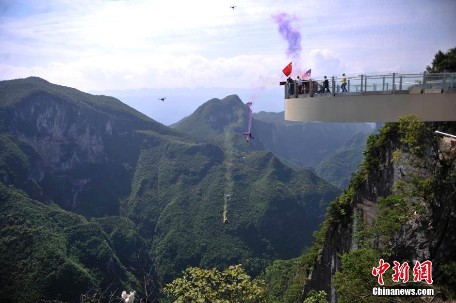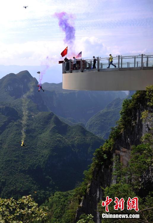 4月26日,世界顶级飞人Miles和中国第一飞人徐凯在世界最长悬挑玻璃廊桥上表演低空跳伞。当日,享有“世界最长悬挑玻璃廊桥”美誉的重庆云阳龙缸云端廊桥正式对公众开放。陈超 摄