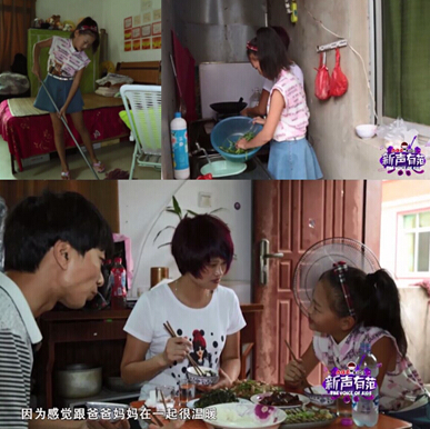 节目中另一位让观众印象深刻的孩子王丽妍,生活中和爸爸妈妈一起洗菜煮饭、扫地拖地,在家里一边做家务一边练歌,这些都是这位孩子的日常。生活还给了她两位最有爱的听众--王爸爸王妈妈。“生活中常会听到丽妍唱起一首又一首动人的歌,虽然不能教她什么技巧,但只要是她唱的我们就觉得好听,很为她骄傲。”王爸爸妈妈还说丽妍常会在饭桌上和他们分享自己的音乐梦想,他们对丽妍的决定也很是支持。也正因为这份生活中温暖的互动,才让王丽妍拥有了成熟有爱的个性,唱歌对于她来说才会“像妈妈那双温暖的手”吧,她的歌声也才能唱到心坎里吧。