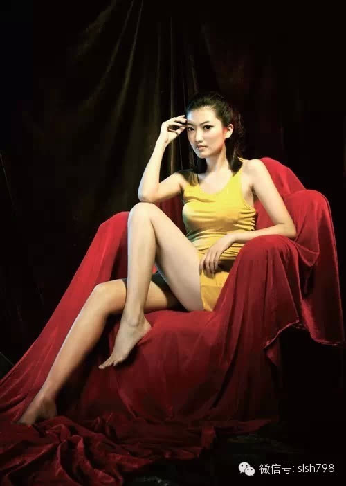 侧卧性感身姿是古典油画中经常采取的身体姿态,它最能体现女性身体舒缓的线条之美,同时,这种姿态,可以让女性更为放松,因此作品表现会更为自然。当模特侧卧时,最好在她身后有些垫靠,这样即可以让她的身体半侧面向镜头,同时也可以让其身体挺直起来,防止太过懈怠、塌陷。最好有一条腿伸直拉长身体线条,另一条腿略作蜷曲曲线,而上身最好采用半依半靠的略直立状态,手臂的动作最好自然,如一手臂向前枕在头下,而另一手抚在身体上部,更加协调。