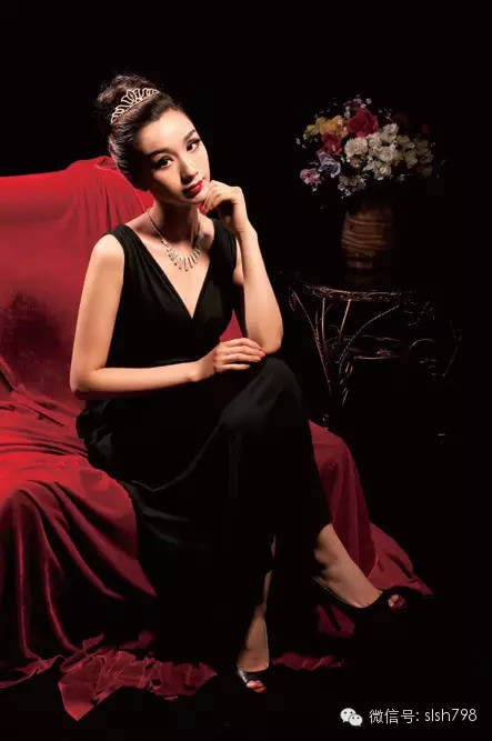 这是更具有古典而雅致的坐姿。人物仅仅是浅坐在椅子的边缘,上身挺拔,双腿可以搭在一起,但需要注意接触地面的脚要欠起,增加小腿的长度感,表现身姿的修长。头部略微倾斜一些,注意双手的协调配合,最好能够收紧靠近身体,一只手搭在膝头,一只手支撑下颌,保持庄重状态。这种典雅的姿态,不但适合于女性的单独写真,同时也适合于双人合影,如在婚纱照中,男性站立在她身后,略倾向女性,亲密感自然流露。