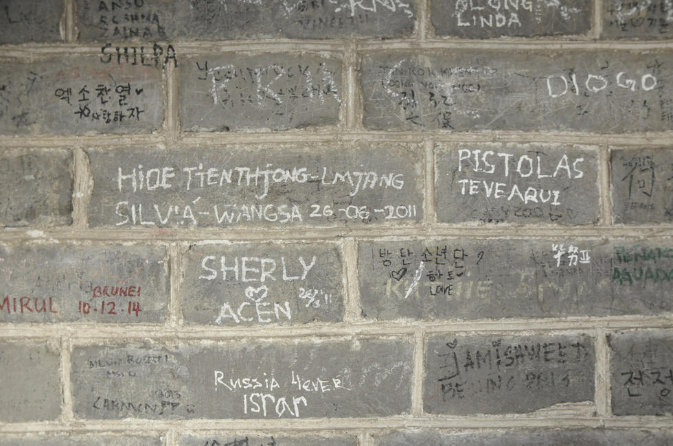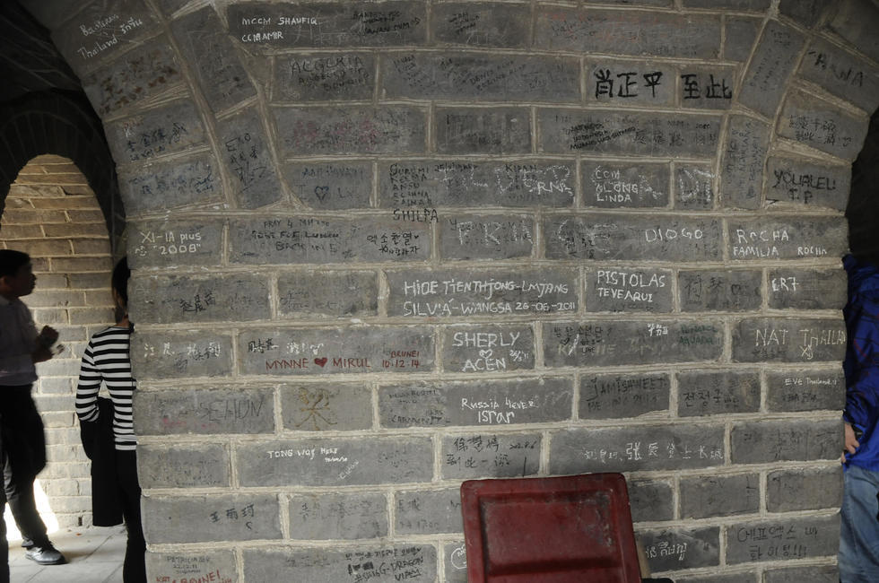 2015年10月4日,北京国庆节居庸关长城人满为患,在西南侧的8号烽火台,内外均有很多的长城砖上被人刻多国文字,烽火台的内部可谓是惨不忍睹,满视野均是大大小小的汉字,以及多国文字。