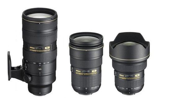 尼康AF-S 14-24mm f/2.8G ED镜头+AF-S 24-70mm f/2.8G ED镜头+AF-S 70-200mm f/2.8G ED VR II防抖变焦镜头,这三支金圈变焦镜头的组合我们俗称为“尼康大三元”。一支超广变焦,一支标准变焦,一支远摄变焦镜头,刚刚好组成了从14mm-200mm端的一个焦段全覆盖,且全程最大光圈恒定F2.8,非常适合婚礼等各种纪实类的拍摄。