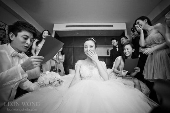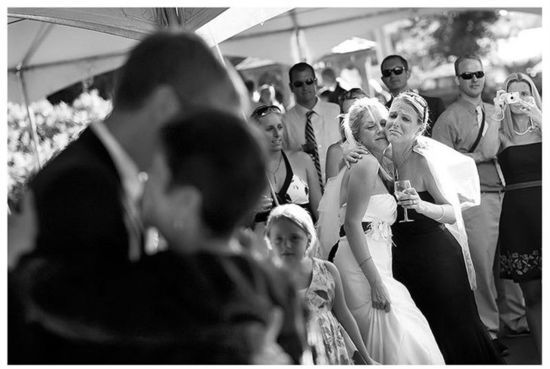 上图中的主角不是婚礼现场的新人,焦点落在了后面新娘的闺蜜身上,而新郎和新娘成了前景。这是摄影师对现场敏锐的观察后,在已经拍摄了新人照片的前提下,果断记录了周围群众们的状态。她们被现场的环境所感染而相拥流涕。这时如果使用的是一支变焦镜头,我们就可以在不移动身体的情况下,轻易地调整焦段进行拍摄。不会错失“良机”,也不会惊动到被摄对象。